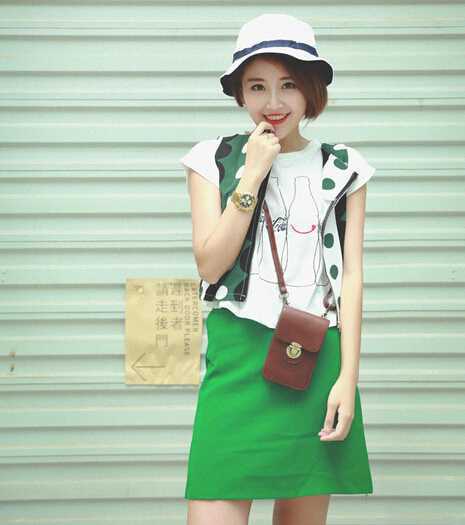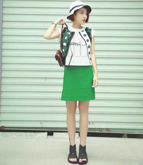 糖果青色夏季包臀短裙,是极具修饰出女性身材曲线美的单品,搭配白色印花t恤衫,玩趣味十足呢,拎着复古风包包,戴上防晒帽超潮哦。