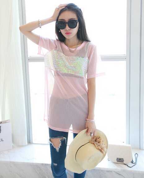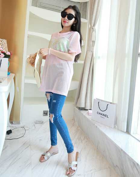 极具时尚度的韩版微透视t恤衫,粉嫩颜色很适合甜美度的女生哦,搭配高腰破洞小脚裤,个性独特又那么的显高呢,即使搭配平底鞋也能很显高哦。