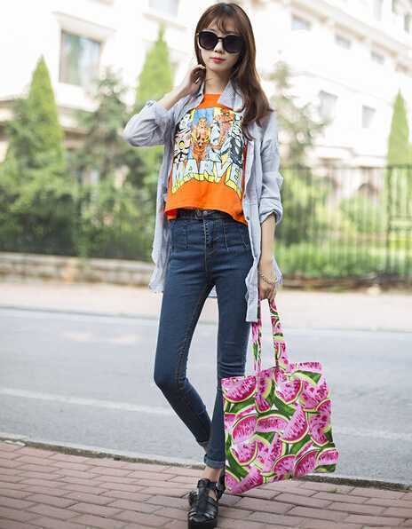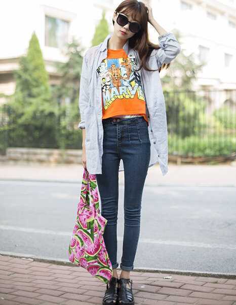 纯色休闲风短款t恤衫,简约不失时尚感,巧遮腰部的赘肉,搭配紧身牛仔小脚裤,很好的修饰出小细腿,阳光般的夏天外搭一件防晒衫,轻松穿出时尚巧遮阳。