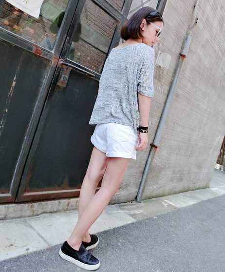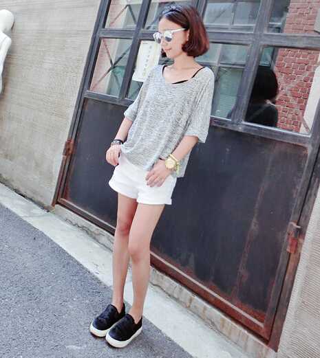 松垮感夏季t恤衫,轻松遮住腰部小赘肉,搭配白色短裤很好的秀出小细腿,很清凉与好看,炫酷的反光墨镜,走起时尚范~~~