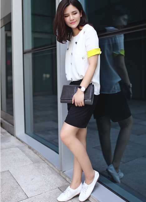 夏季白色水钻雪纺衫,飘逸的雪纺面料,闷热的夏天秀出清凉的感觉,搭配黑色修身短裤,秀出纤细的大长腿,随心搭配一对平底鞋,穿起时尚风。