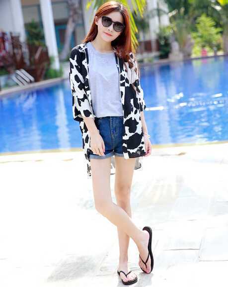 黑白长款雪纺衫,轻薄小清新款式,让你夏天不闷热,搭配t恤衫简约不失时尚感,搭配牛仔高腰式短裤,秀出你的大美腿,穿出十足潮范儿。