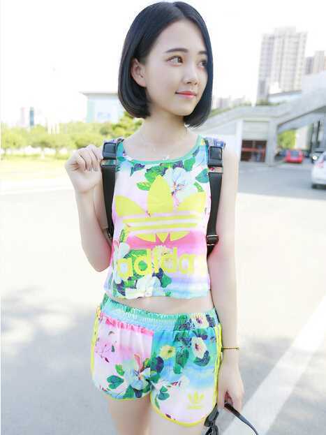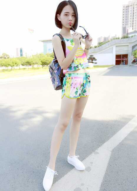 迷彩碎花套装是今夏流行款单品,炫彩的颜色衬出白皙的肤色,十足的时尚养眼哦,搭配与上衣一致颜色的短裤,以套装的形式穿出街,十足运动潮流。