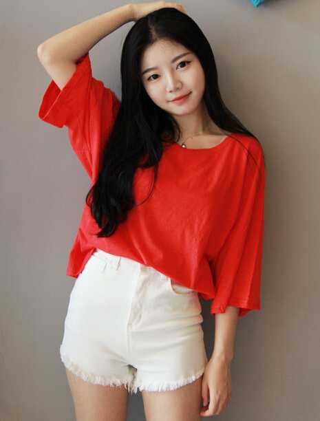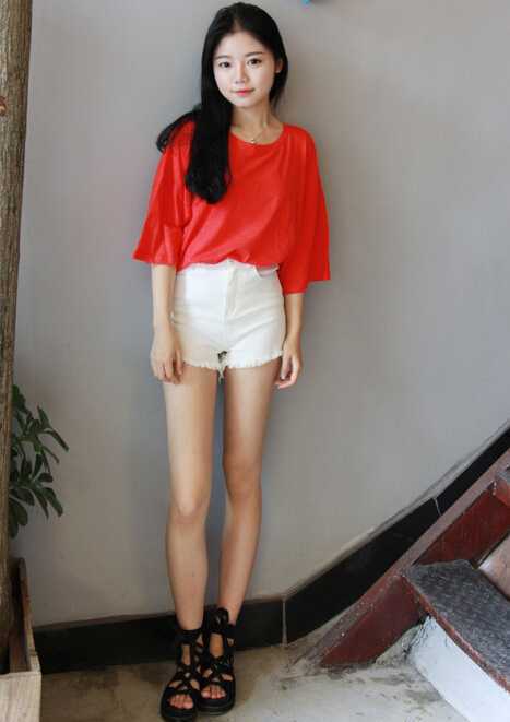 慵懒休闲款的t恤衫,搭配白色高腰式热裤,秀出纤细的美腿。穿出十足潮范儿。