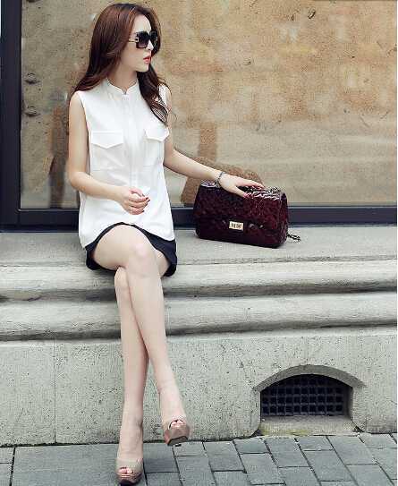 白色雪纺背心衫,带来一丝丝清凉般的感觉,搭配黑色短裤秀出你的细腿,穿出十足韩范儿,加上一对鱼嘴高跟凉鞋,提升气质与女人魅力哦。