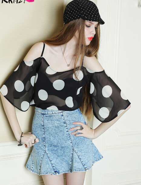 俏皮感波点夏季雪纺衫,微透视雪纺面料,秀出你的美肌很性感迷人,束腰搭配鱼尾牛仔短裙,秀出你的小细腿,穿出十足显瘦时尚范儿。