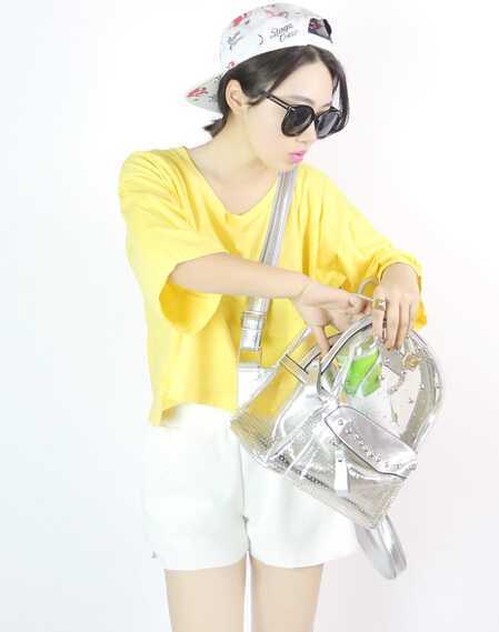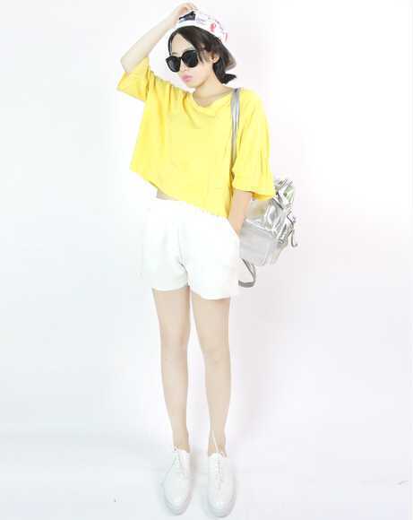 亮眼黄色宽松款t恤衫,短款设计微露出肚脐,很性感与清凉感,搭配一条休闲裤,让你轻松自在的运动起来,穿上一对一运动鞋,很舒服呢~~~
