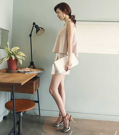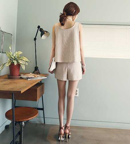 夏季米白色棉麻宽松款吊带衫,秀出纤细的美臂很清凉哦,搭配与上衣一致颜色的短裤,一整套的服装搭配穿出十足时尚感,加上一对鱼嘴高跟鞋,优雅不失女人味魅力。