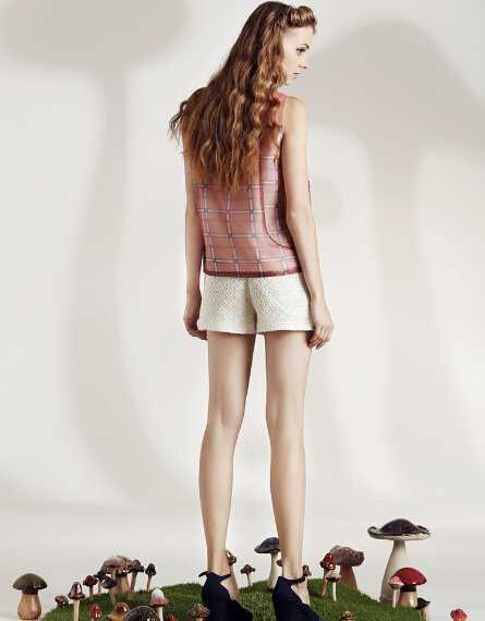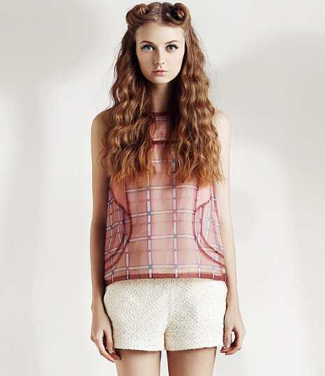 微透视欧根纱雪纺背心衫,经典格子设计简约不失时尚感,搭配蕾丝修身短裤,修饰出小细腿很显瘦,配上蛋黄烫卷长发,颇具可爱甜美哦。