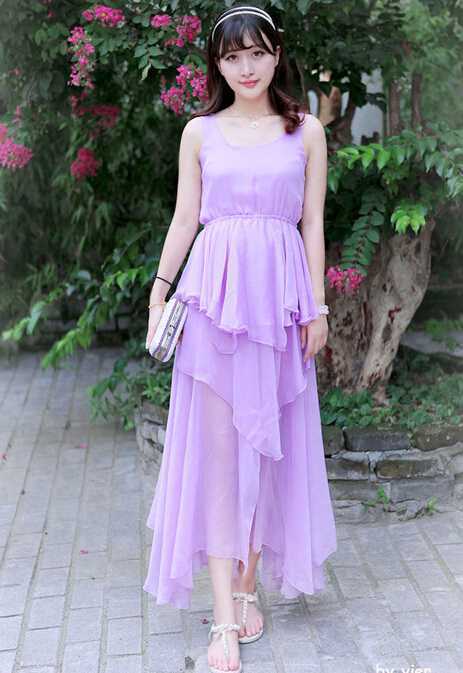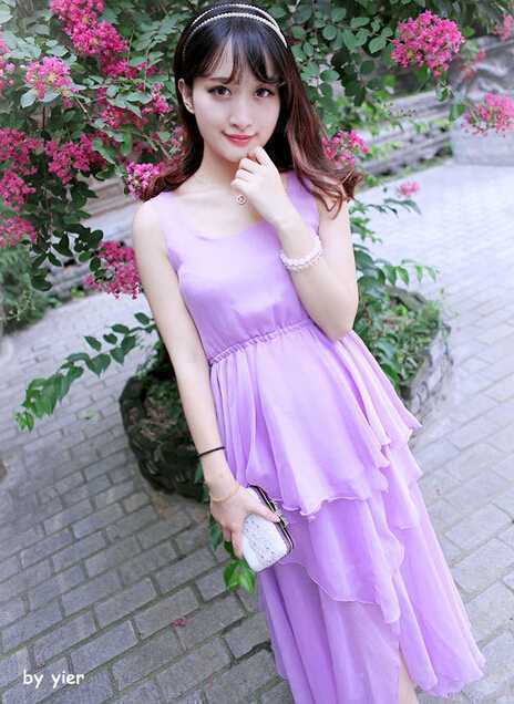 浪漫紫色夏季不规则连衣裙,飘逸的雪纺面料,展现出柔美女人的魅力美,搭配珍珠平底鞋,彰显出低奢华高档次,再搭配上一个淑女发箍,很修脸哦,穿出十足仙女范儿。