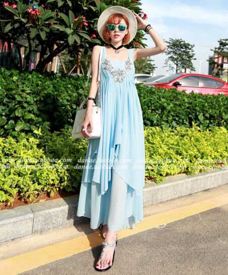 度假风飘逸的长裙,嫩蓝的色彩衬出白皙的肤色,搭配水钻平底鞋,让你在暑假旅游中倍感时尚感,带来墨镜与编织帽,快乐去旅游吧~~~