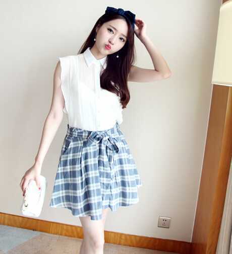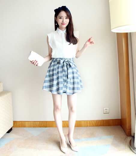 蓝色夏季格子短裙,随意打个蝴蝶结很显甜美哦,搭配蕾丝无袖雪纺衫,秀出你的美臂,让你在炎热的夏日,轻松享受到清凉的气息。