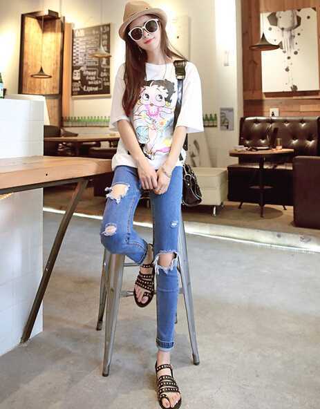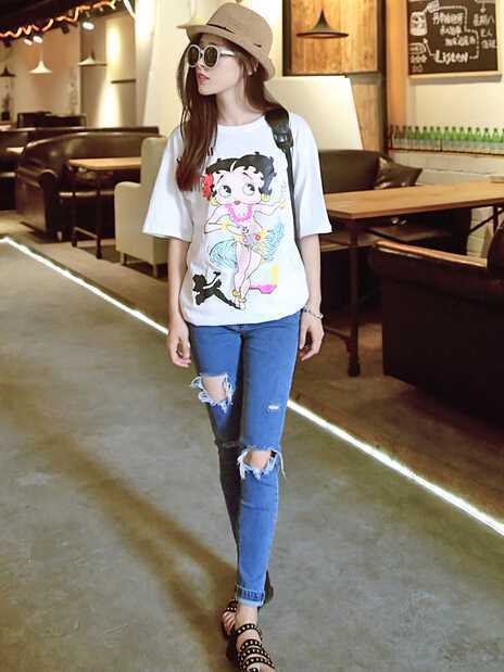 可爱的印花图案t恤衫,宽松的款式巧遮小肚腩,搭配破洞牛仔小脚裤,修饰出小细腿很显瘦,搭配一对平底鞋舒适夏天出街吧。