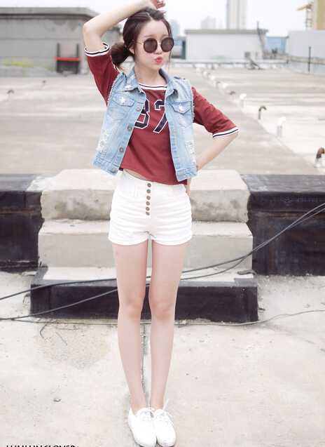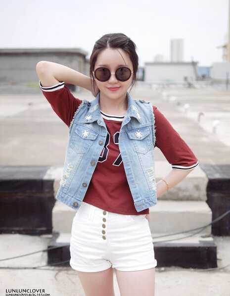 牛仔破洞夏季马甲,搭配复古红t恤衫,清爽不失时尚,搭配高腰式短裤,秀出美腿很酷哦。
