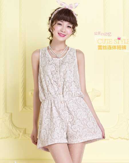 蕾丝无袖夏季连体裤,蕾丝的时尚元素颇具女人味道,搭配粉色绑带式高跟鞋,秀出你的高挑好身材吧,戴上发箍十足的甜美可爱feel。