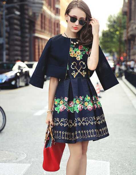 欧美风秋装深蓝色绣花套装,蓬蓬的裙摆展现出你很“女人”的一面,搭配一对性感味的镂空细高跟鞋,十足的潮流哦~~~