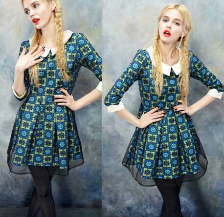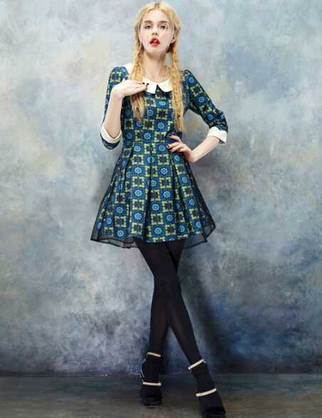 夏季娃娃领印花连衣裙,娃娃领点缀减龄又不失可爱感,蓬蓬的裙子展现出很女人的一面,搭配性感黑丝袜和高跟鞋,秀出你的高挑好身材吧,这样穿出街绝对百分百回头率!!!