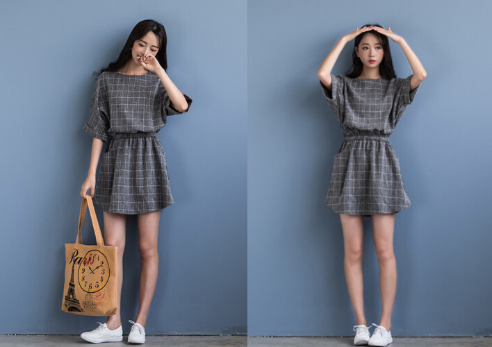 连衣裙搭配04》》》》》经典的灰色格子连衣裙柔软又舒服,松紧腰的设计能立显好身材,再配上一双百搭的小白鞋,浑身上下都充满着清新的文艺感觉,拿上一个醒目简单的帆布包就能轻松出门喔!