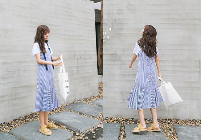 连衣裙搭配05》》》》》韩版类型的连衣裙想必女生们都是非常喜爱的,竖条鱼尾的连衣裙新颖独特,搭配着白色T桖就更显清纯。一双姜黄色的厚底拖鞋更是将整体造型衬托出时尚大气的气质,让人不得不注意。