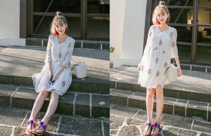 连衣裙搭配03》》》》》雪纺类型的刺绣白色连衣裙演绎了不同一般的异域风格,干净舒适的款式能让女生们在盛夏轻松驾驭,而可爱的毛球人字拖为整个造型起到了加分的作用,增添一丝活泼俏皮的时尚感。