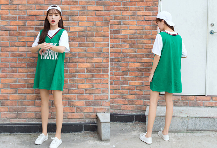 连衣裙搭配01》》》》》假两件式的连衣裙显瘦好看,洋溢着青春气息的绿色十分适合夏天,在白色鸭舌帽以及小白鞋的搭配下,整个造型都充满着朝气与活力,这样的时尚穿搭十分地适合运动型的女生,相当好看。