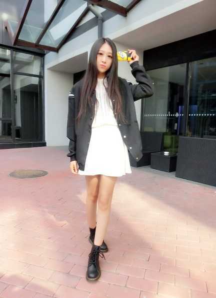 非常混搭的一套搭配,潮流之余也特别适合S号MM穿哦,男朋友风的棒球服外套,帅气十足,内搭小性感半透的小衫和甜美暗纹裙裤,既拉长身线也轻松显高,搭配一双机车靴,S女生也可摇滚起来。