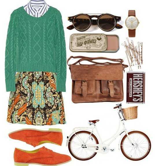 粗纹厚实针织衫内衬竖横条衬衫,很百搭青春,下身一条复古大印花短裙,拉长整体黄金比例,尽显纤细高挑身姿,一对橙色磨砂面真皮鞋子很洋溢,配上复古圆眼镜+棕色手表+复古邮差包包,带上补充能量的巧克力,一款春光洋溢的出游装扮出来了,配上田园气息的纯白色单车,很自由自在谐意着游玩!