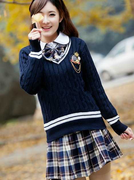 深蓝色的粗纹毛衣,内搭纯白立体领子的衬衫,尽显青春甜美英伦范,搭配与上衣同色系的格子短裙,搭出很靓丽时尚装扮。
