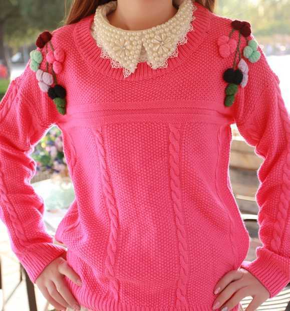 抢眼的玫红色粗纹毛衣,时尚甜美的珍珠领子点缀着,穿起小清新淑女气质,搭配蓬蓬百褶短裙,轻松搭出娇小女生小清新装扮,让你冬日一直靓丽出行。