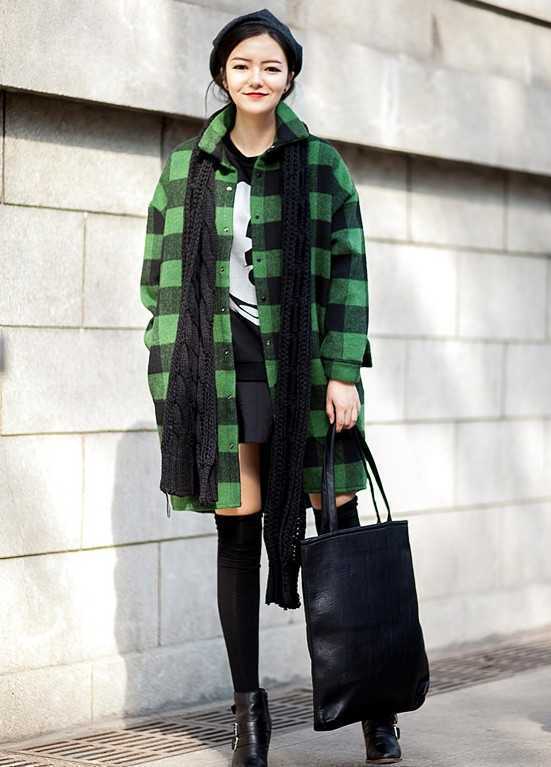 经典的黑色过膝袜子,微微露出腿部一小部分的肉肉,性感之余凸显纤细腿形曲线,搭配绿色格子毛呢大衣,很温暖很时尚,如此巧妙混搭装扮,让矮小个子女生轻易穿出高挑欧美风装扮。