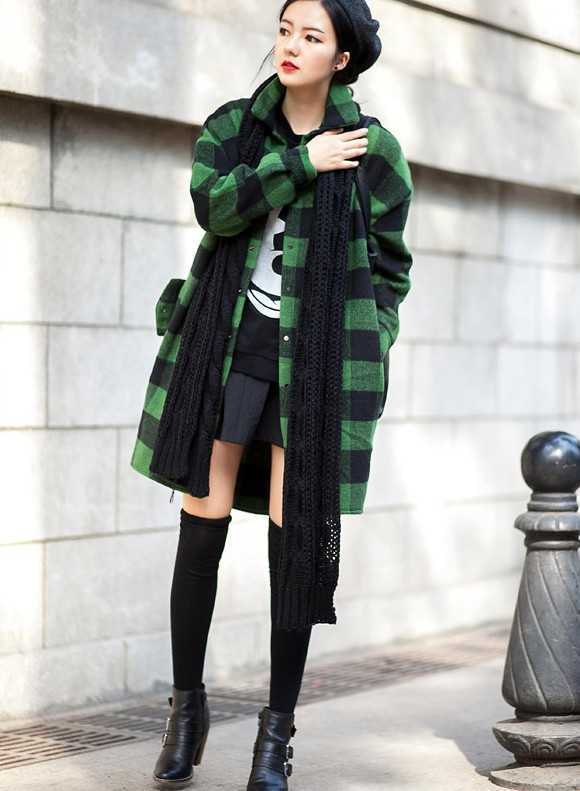 黑色经典过膝袜搭配绿色格子大衣