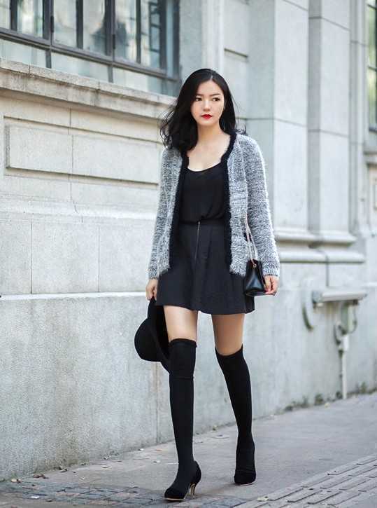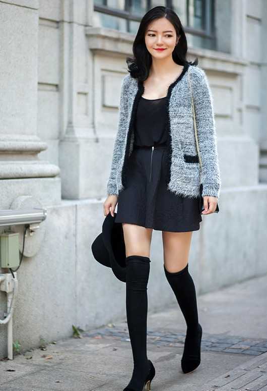 短款的灰色小香风开衫外套,搭配黑色小性感短裙,范气十足。搭配简约款型的黑色过膝袜,超显高显瘦,凸显玲珑有致身段,搭配黑色的高跟鞋,更加拉伸腿部曲线,呈现出时尚欧美风范女性魅力,矮小个子女生也能轻易驾驭。