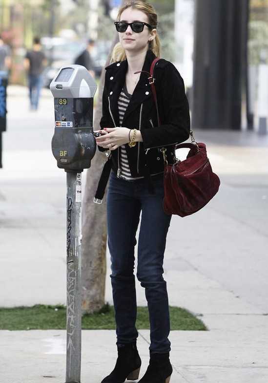 酷气个性的黑色外套,内搭横条纹背心,酷气又不失时尚感,下身搭配显高紧身高腰牛仔裤和黑色低跟靴子,轻松穿出高挑身姿,随意斜跨复古红包包,显得格外复古时尚感十足。
