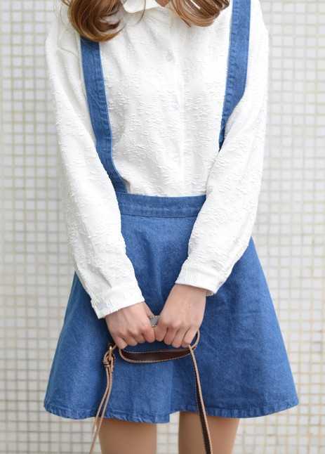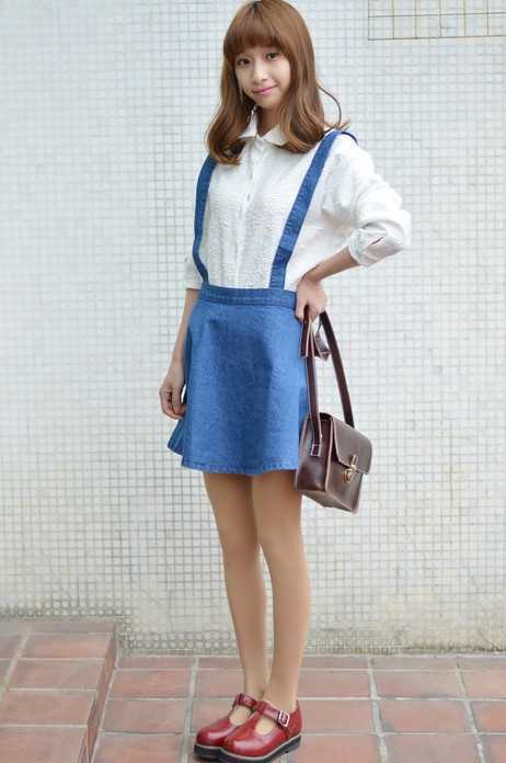 春季蓝色背带高腰短裙,是矮个子必备的显高搭配单品,随意内搭净白色衬衣,很时尚好看呢!