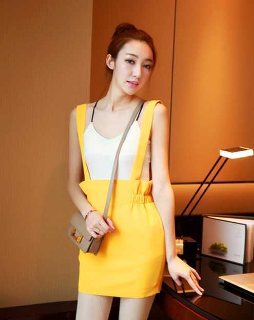 黄色春季背带高腰短裙