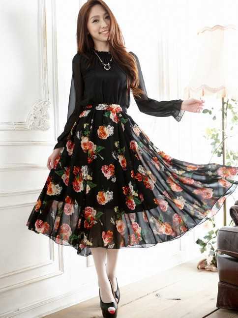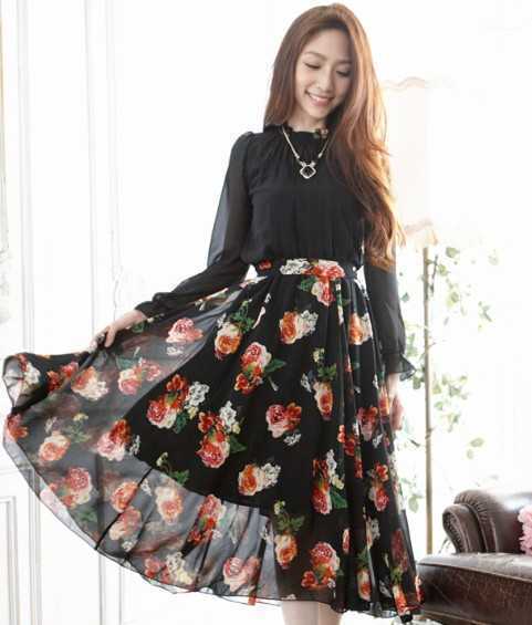 春季黑色印花连衣裙,柔软雪纺材质,穿出仙美又舒适。