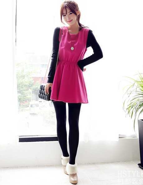 春季玫红色收腰连衣裙,搭配黑色打底裤,很显瘦显高,搭配驼色高跟鞋,穿出甜美淑女范儿 ,随意拎着黑色包包,很甜美大气,很适合约会或逛街穿着。