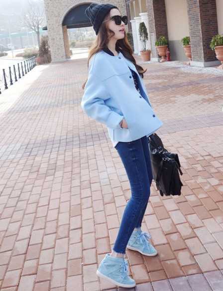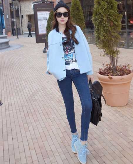 韩范十足春季天蓝色短外套,搭配清爽的宽松T恤,很显俏皮活力感,搭配紧身小脚裤,凸显出高挑好身材,穿出休闲显高装扮。