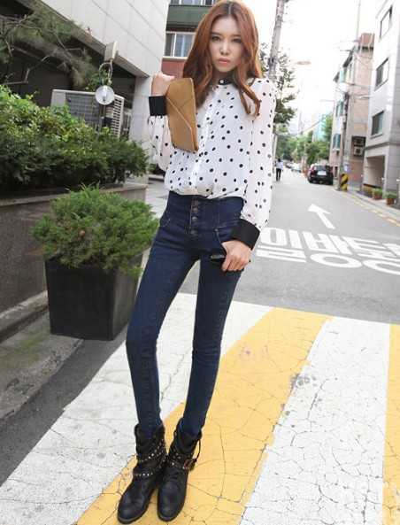 酷帅春季韩版高腰小脚裤,完美拉长腿部曲线,秀出高挑身材,搭配可爱感波点雪纺衫, 穿出时尚又不失俏皮感,加上黑色短靴,尽展帅酷韩范儿。
