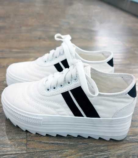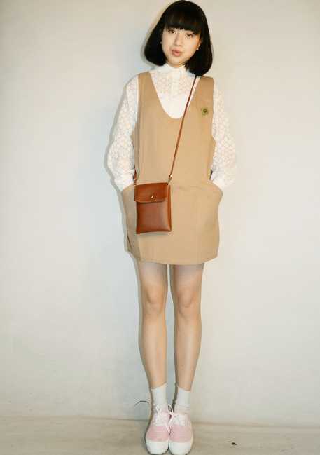 韩范十足的休闲厚底鞋,粉嫩的颜色很可爱迷人,搭配减龄必备背带裙,很显青春俏皮感,搭配白色雪纺衫,演绎出乖乖女好形象。