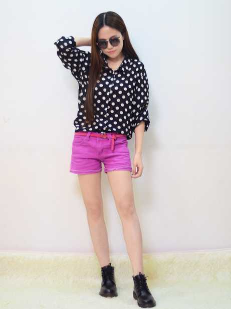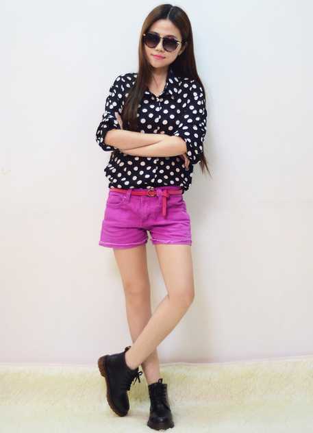 通勤款黑色波点雪纺衫,很有时尚OL范儿,束腰搭配玫红色超短裤,很养眼夺目,轻松秀出纤细美腿,搭配黑色鞋子,时尚风穿出来。