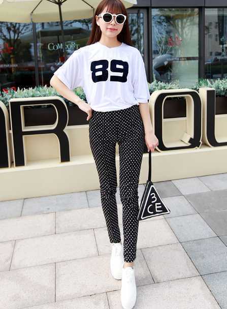 紧身黑色波点高腰裤,修饰出纤细美腿,显高又显瘦。
