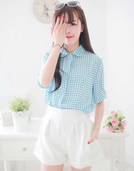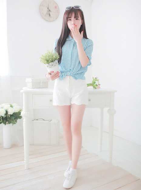 夏季高腰短裤,束腰搭配格子衬衫,凸显纤细小蛮腰,还很显高喔。