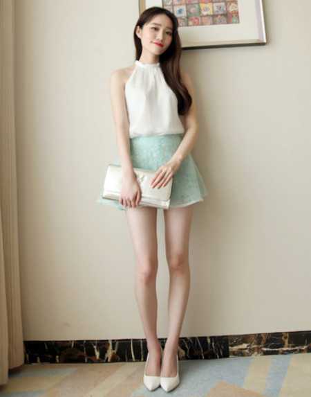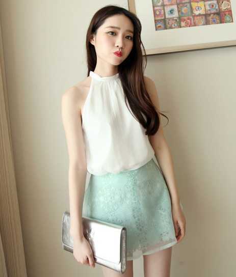 韩版欧根纱蕾丝短裙,高腰版型很显高挑,束腰搭配无袖雪纺衫,凸显纤细小蛮腰,搭配白色高跟鞋,凸显高挑身材,尽展优雅名媛范。