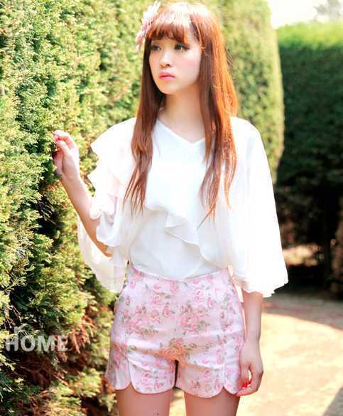 夏季高腰碎花短裤,凸显纤细美腿,搭配不规则雪纺衫,穿出甜美淑女风,搭配白色高跟鞋,完美展现出优雅女人气质美。