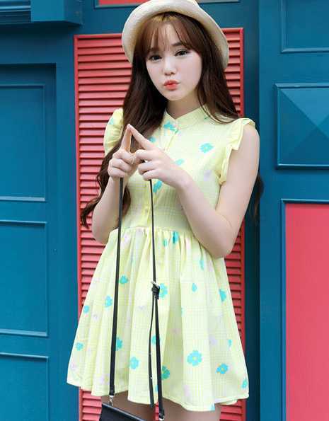 亮黄色的短款连衣裙,铺满了小碎花给人小清新般气息, 超短款设计,露出大部分腿部肌肤,带给人一种高挑的错觉, 即使搭配平底鞋,照样能让你看起来高挑显瘦,斜跨黑色迷你包,很随性酷气。