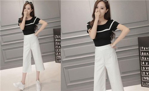 该款修身T恤衫穿起来时尚简约,而且风格百搭,搭配条纹的高腰阔腿裤,很好调整了身材的比例,也凸显了身高,喜欢简洁休闲穿搭的朋友,不妨就这样穿起来吧。