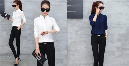 该款春季穿搭是属于通勤装,立领的衬衫显得有气质大方,配上黑色的修身西装裤,拉长了身体的线条,想要显高可以这样穿,对于职场女士这样可以穿出时尚摩登范。