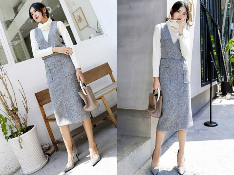 25到40岁的女生不妨试试这款搭配哦,简单的白色高领毛衣作为内搭,显得大方温婉,外搭一套雪花灰色的高腰两件套,上身是深V领的短背心,下身是中长款直筒半身裙,整体修身显瘦,将妹子姣好的身材展现的淋漓尽致,脚上再穿一双尖头高跟鞋,增高之余更是使妹子优雅端庄的一面展露无遗。