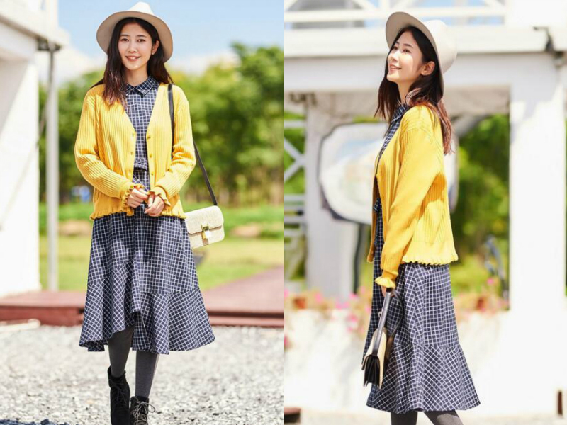 妹子穿的是一条深蓝色的格子连衣裙,娃娃领增添甜美感,长至小腿的鱼尾裙摆飘逸灵动,修饰出妹子优美的身段,外面穿一件鲜黄色针织开衫,显得清新又大方。